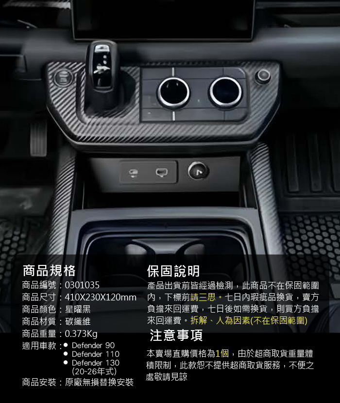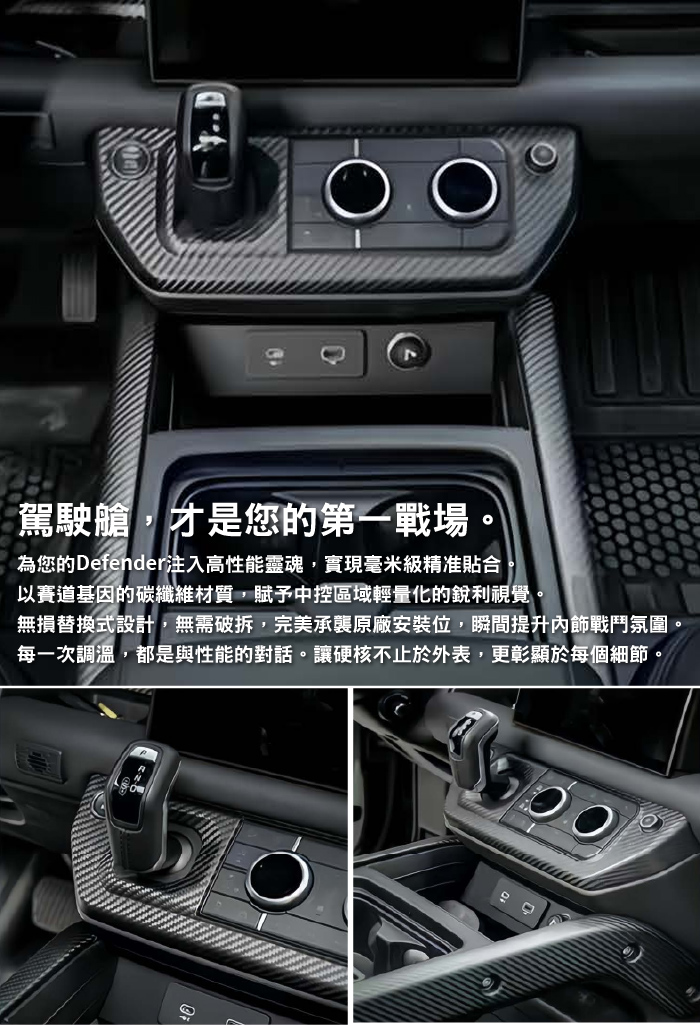 為您的Defender注入高性能靈魂,實現毫米級精准貼合。以賽道基因的碳纖維材質,賦予中控區域輕量化的銳利視覺。