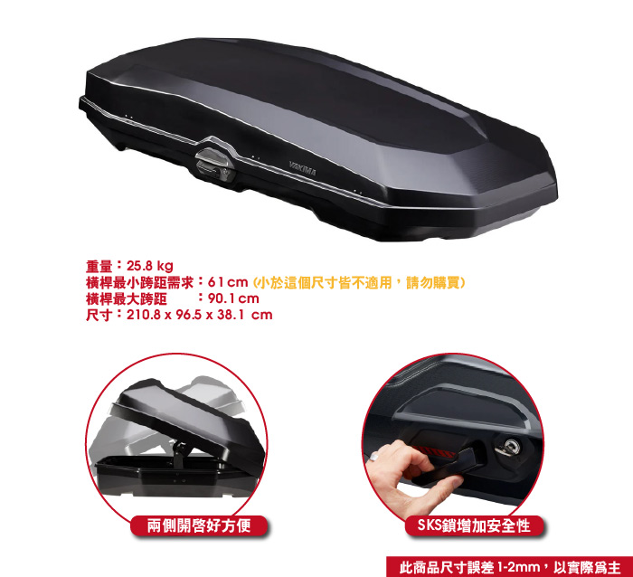 ● 最多可容納 3 人份露營者裝備;或身高 185 cm的單板滑雪板和滑雪板
